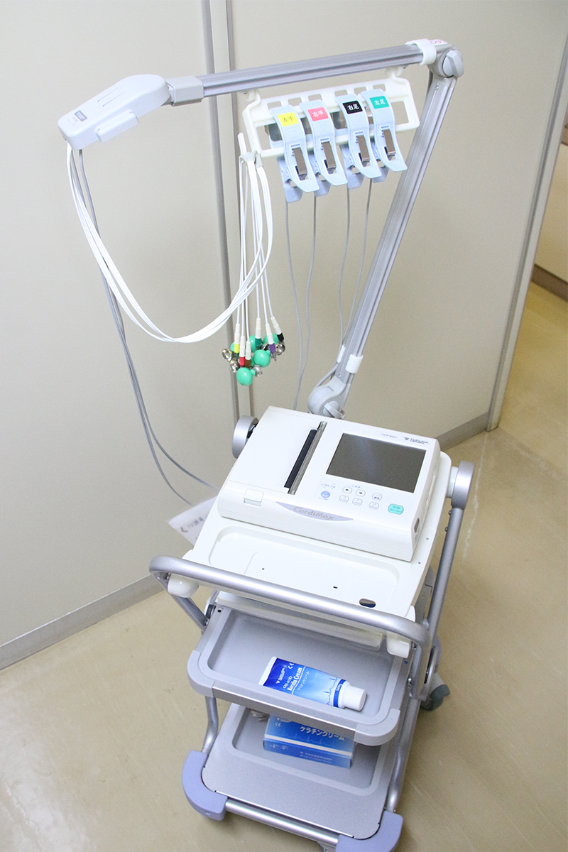 心臓の状態を知るための検査で、心臓の筋肉の収縮に伴って発する微小な電気を波形として記録します。不整脈・狭心症・心筋梗塞などの診断に役立ちます。
