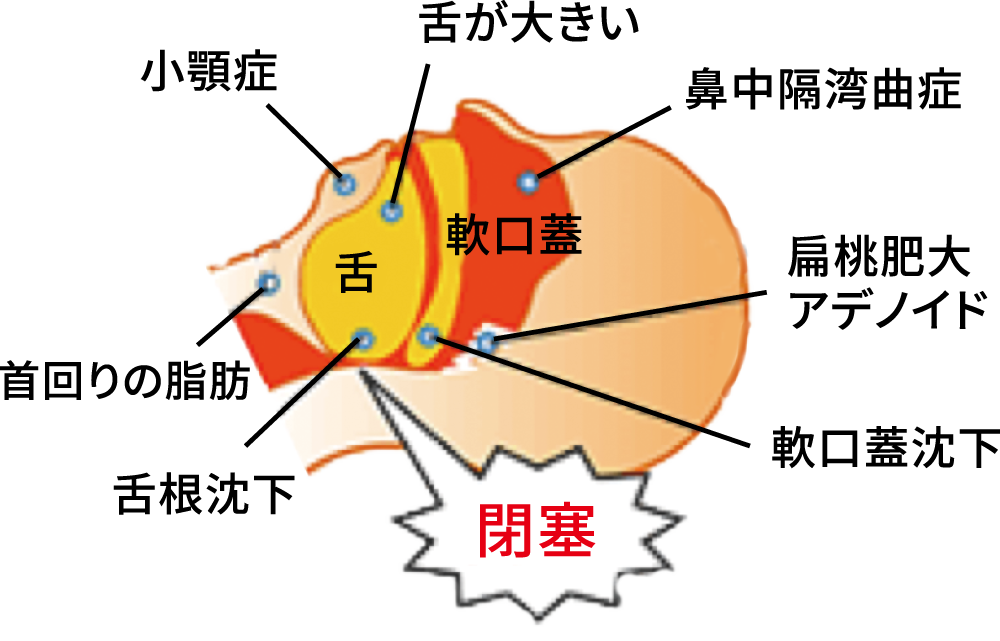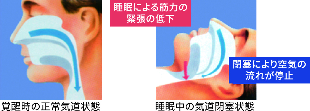 - 寝ているときに、気道(空気の通り道)が塞がり、それによりいびきをかいたり、無呼吸が発生する状態をいいます。